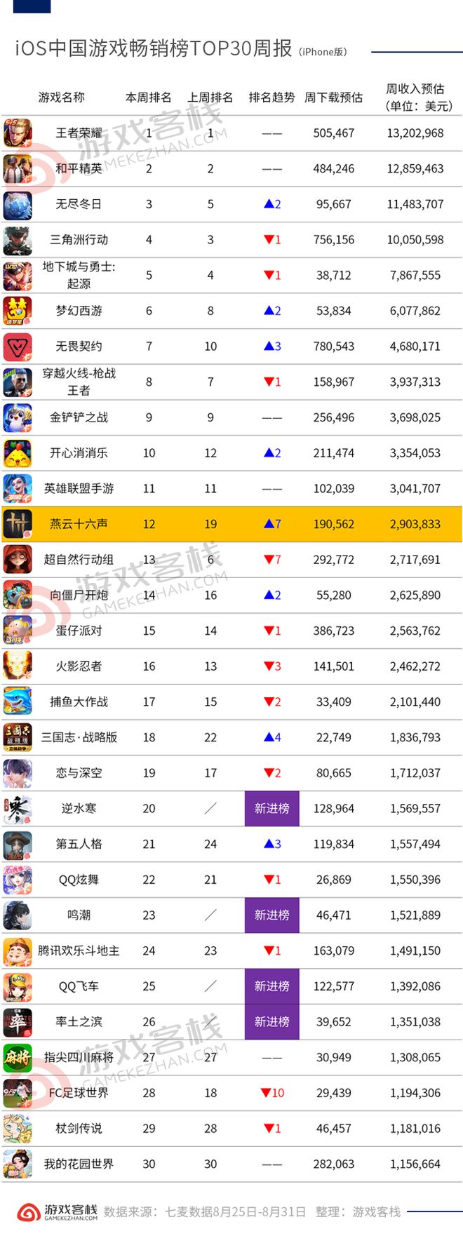 除了《逆水寒》手游外,《鸣潮》《QQ飞车》《率土之滨》上周也重新进入了畅销榜TOP30。